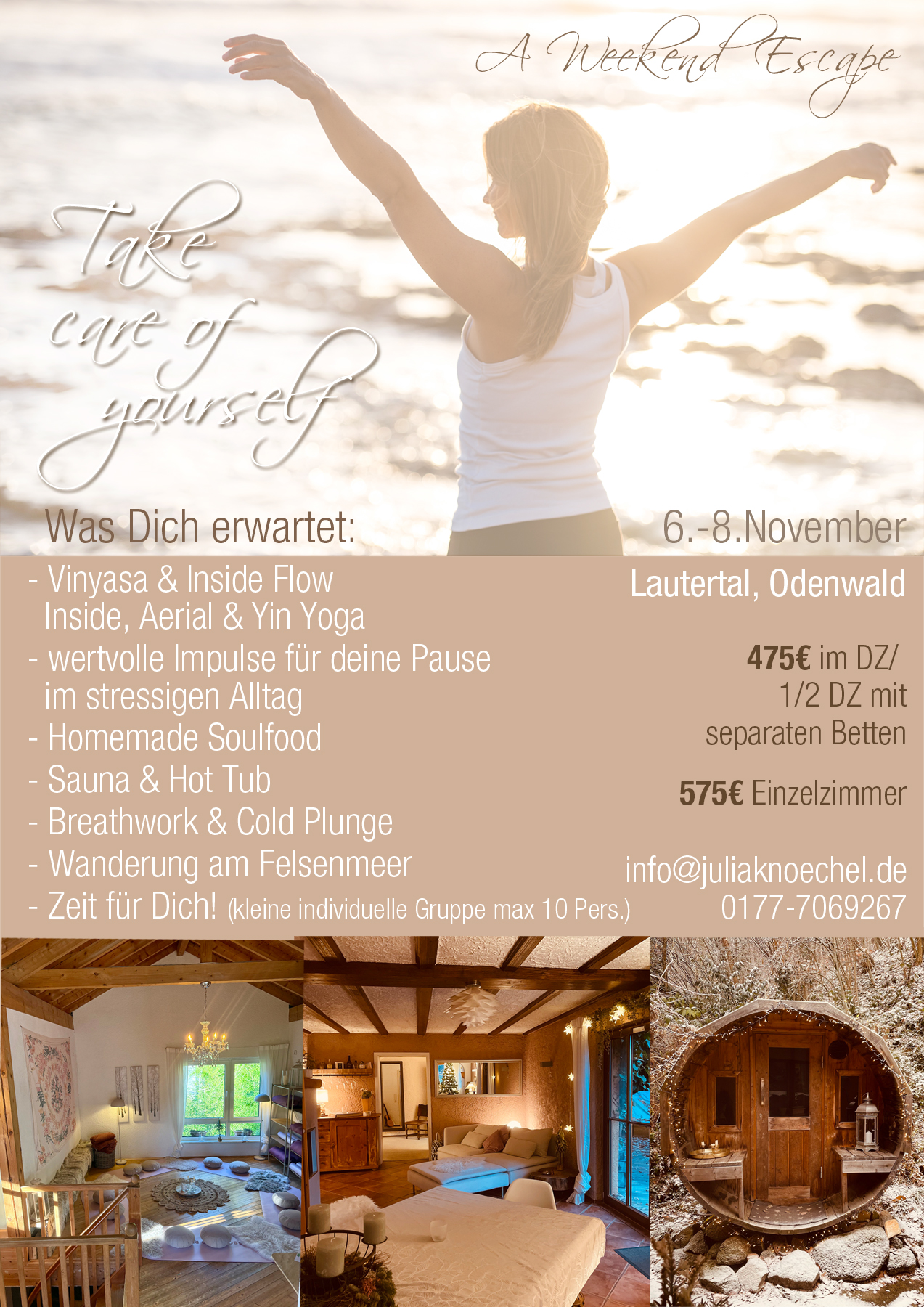 Vom 6.-8. November 2026 findet mein Take care of yourself – weekend escape im wunderschönen Charming Cottage direkt am Felsenmeer in Lautertal, Odenwald statt.
